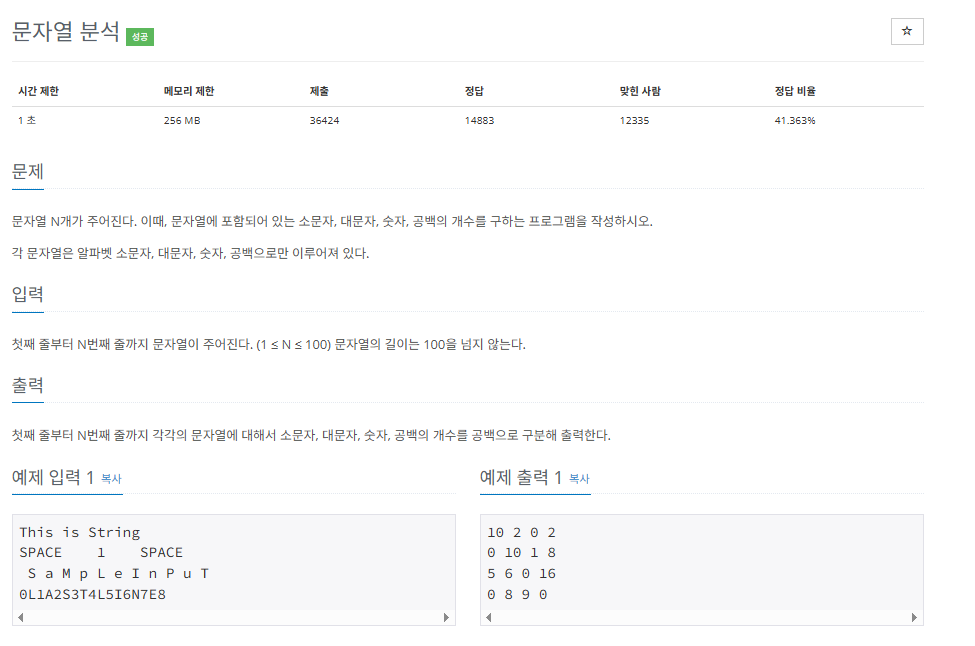 - 여러 개의 문자열이 주어졌을 때 소문자, 대문자, 숫자, 공백을 구분 후 각각 개수를 구하는 문제