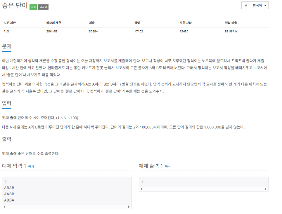 - A와 B로만 이루어진 단어가 주어질 때, '좋은 단어'의 개수를 찾는 문제
